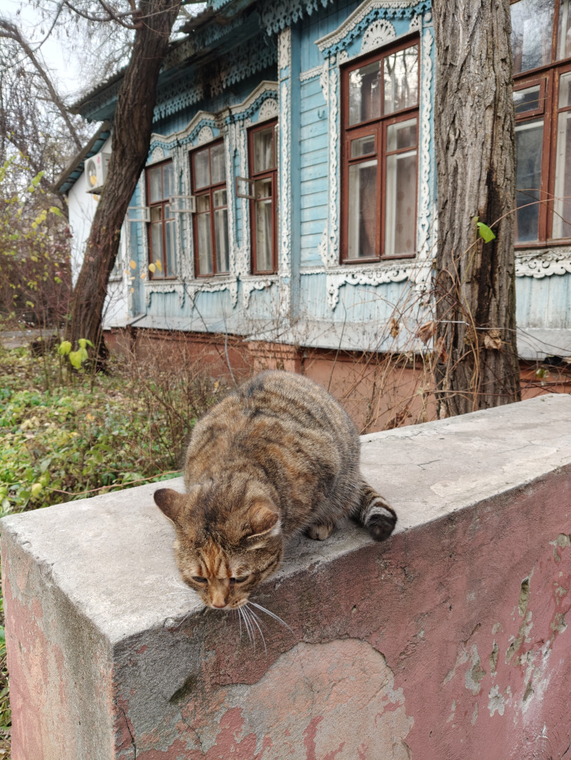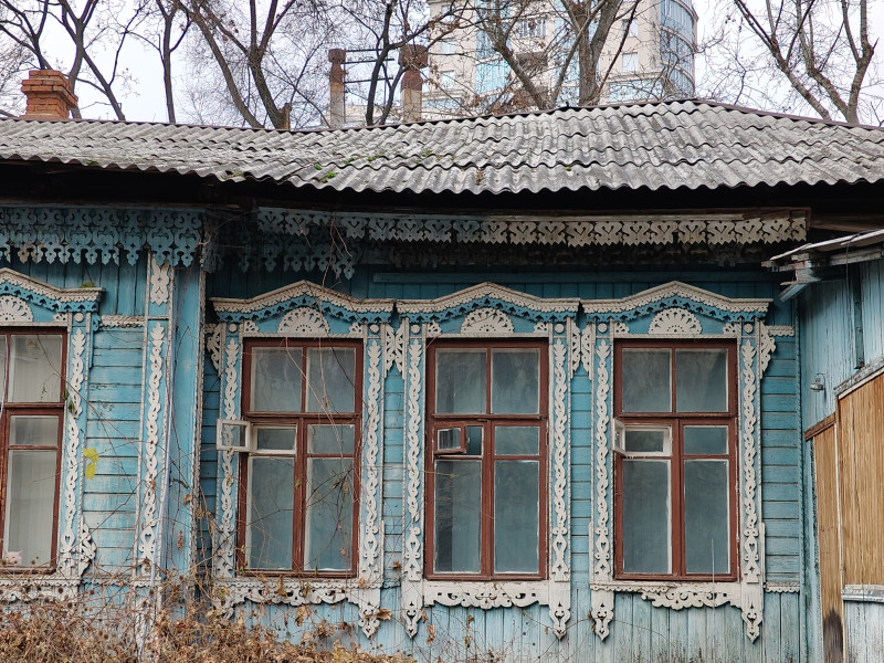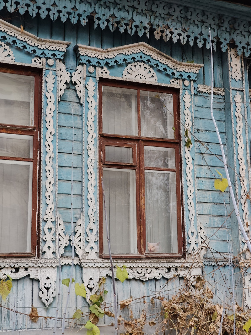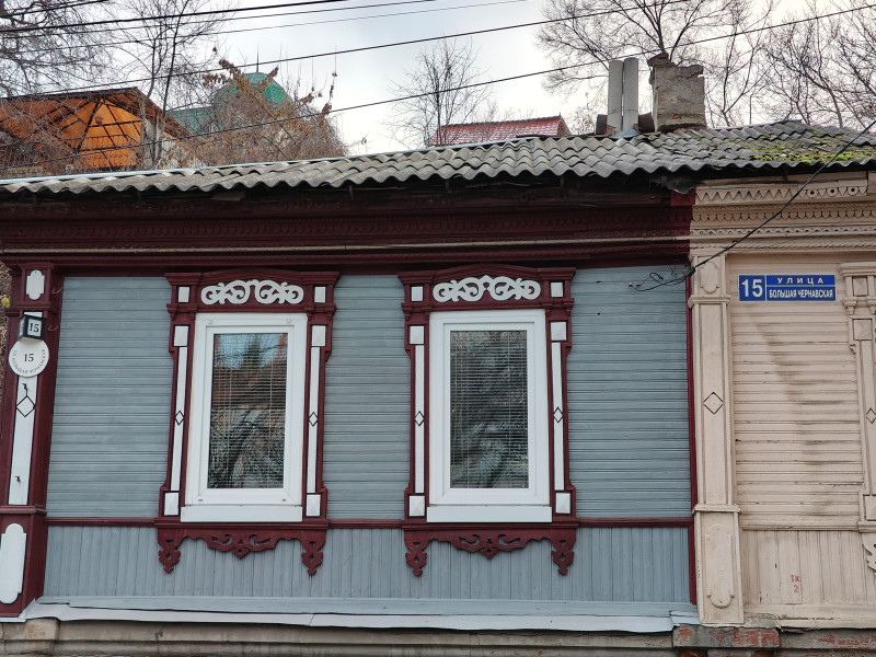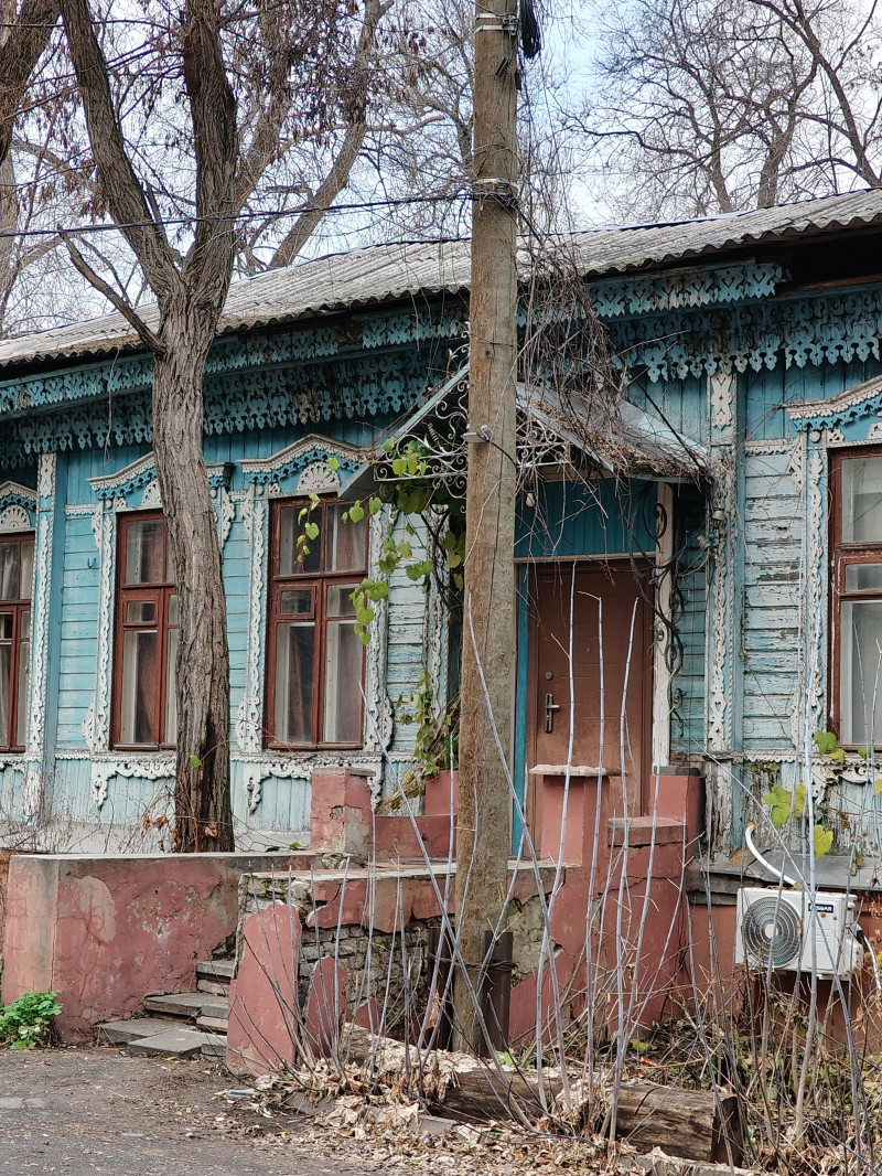 Деревянное зодчество для Воронежа, пережившего Великую Отечественную войну, уникально. Жилой дом начала ХХ века радует красотой деревянных наличников больших окон и резной подкарнизной линией. У дома есть живой оберёг — ласковый котик, который и встретил нас приветливо на территории дома.
