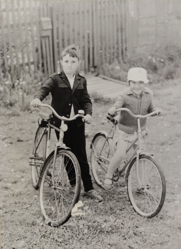 На фото я, около восьми лет, мой первый велосипед из проката, и сосед Мишка. Сзади родительский дом, за штакетником которого вишнёвый сад: