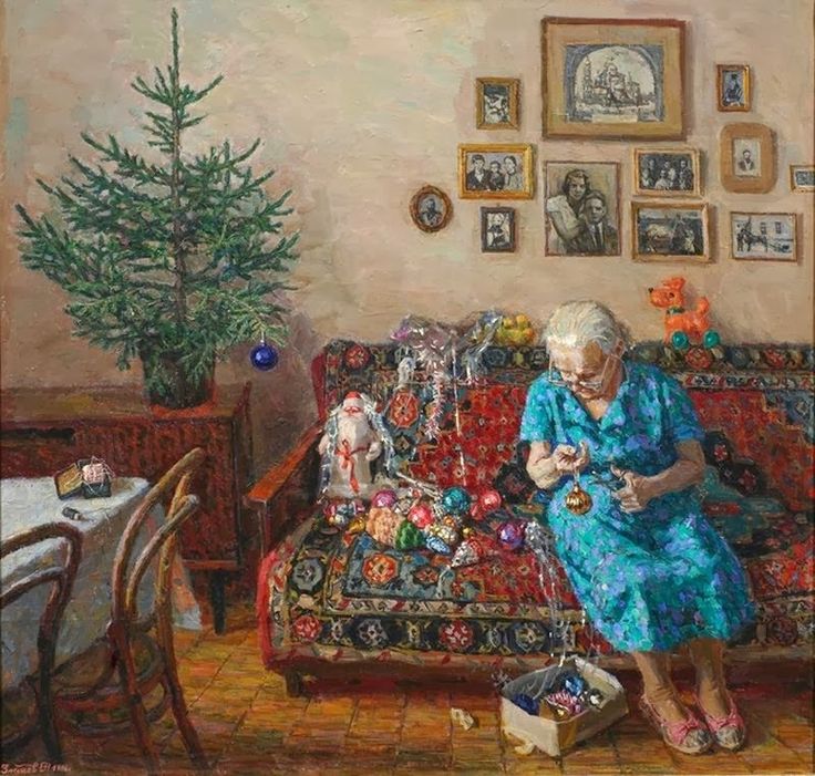 На его картине старушка наряжает ёлку. Живую ёлку. А сзади дивана, на стене, — семейные фотографии, по-видимому, среди них есть и дореволюционные снимки.