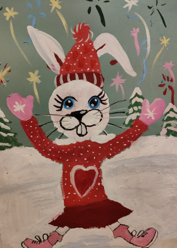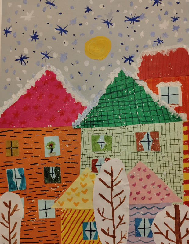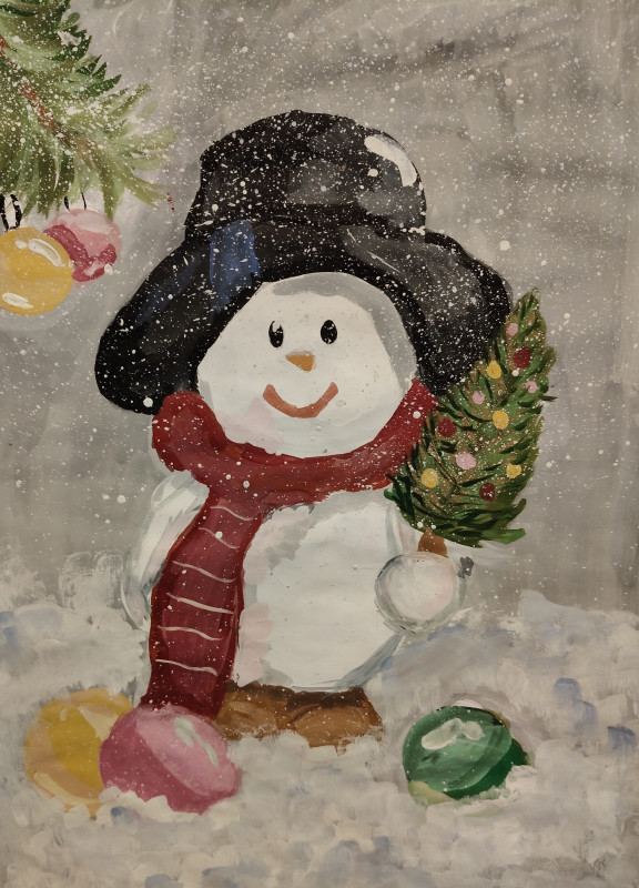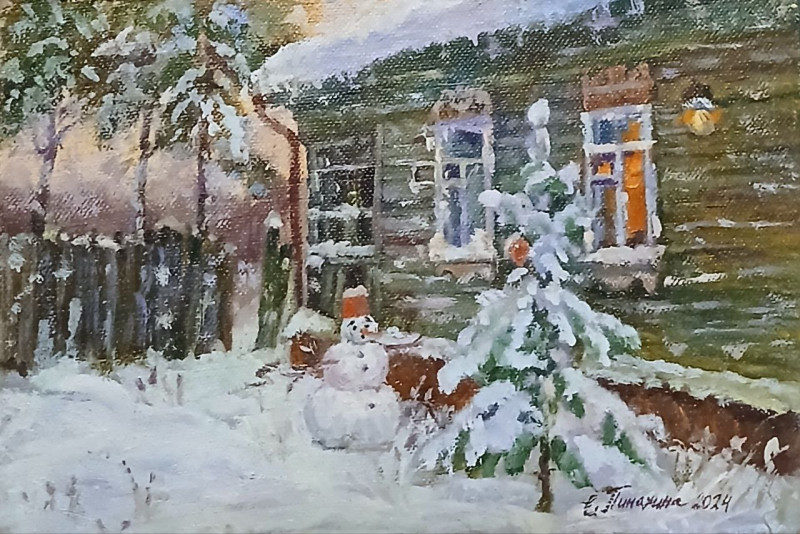 У Лизы также много своих зимних этюдов. Один из них можно шутя назвать «Удивлённый снеговик». Люди слепили снеговика и ушли праздновать встречу Нового года в дом. А он один стоит под окнами и вопрошает: «И где же все?».