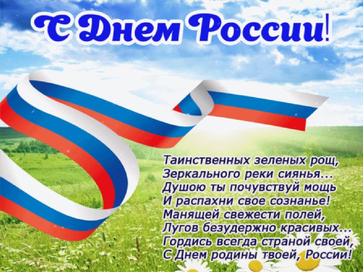 Поздравляю с Днём России! В этот великий праздник великого народа желаю огромных успехов и достижений, постоянного развития и движения к новым высоким целям и рубежам. Пусть крепнет, становится могущественней и сильней наша Отчизна, и пусть жизнь в ней будет счастливой и прекрасной. Здоровья Вам, счастья, процветания и семейного благополучия!