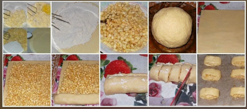 В это время подготовим начинку.Яблоки моем,чистим от кожуры и косточек,нарезаем не большими кубиками.Нарезанные яблочки,засыпаем сахаром и корицей,накрываем миску и отодвигаем в сторонку,пускай пускают наши яблочки сок.А в это время возвращаемся к тесту.Готовое тесто, раскатать прямоугольником.Сверху выкладываем начинку.Разровнять.Теперь тесто сворачиваем в рулет.Ложем швом вниз.Рулет разрезаем,на одинаковые кусочки и выкладываем наши печенья на противень, застеленный пергаментной бумагой. Выпекаем в разогретой духовке до 180 градусов 15 минут. Даём печеньям остыть и посыпать через сито сахарной пудрой. Приятного чаепития! Готовьте с удовольствием!