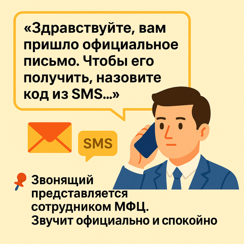 > «Здравствуйте, вам пришло официальное письмо. Чтобы его получить, назовите код из SMS…»