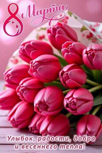 С первым праздником весны, с расцветом природы, с торжеством женственности, с 8 Марта! Желаю изобилия эмоциональных красок, жизнелюбия, доброты, искренности, уникальности, самореализации, открытия в себе новых талантов, любви и удачи во всём!
