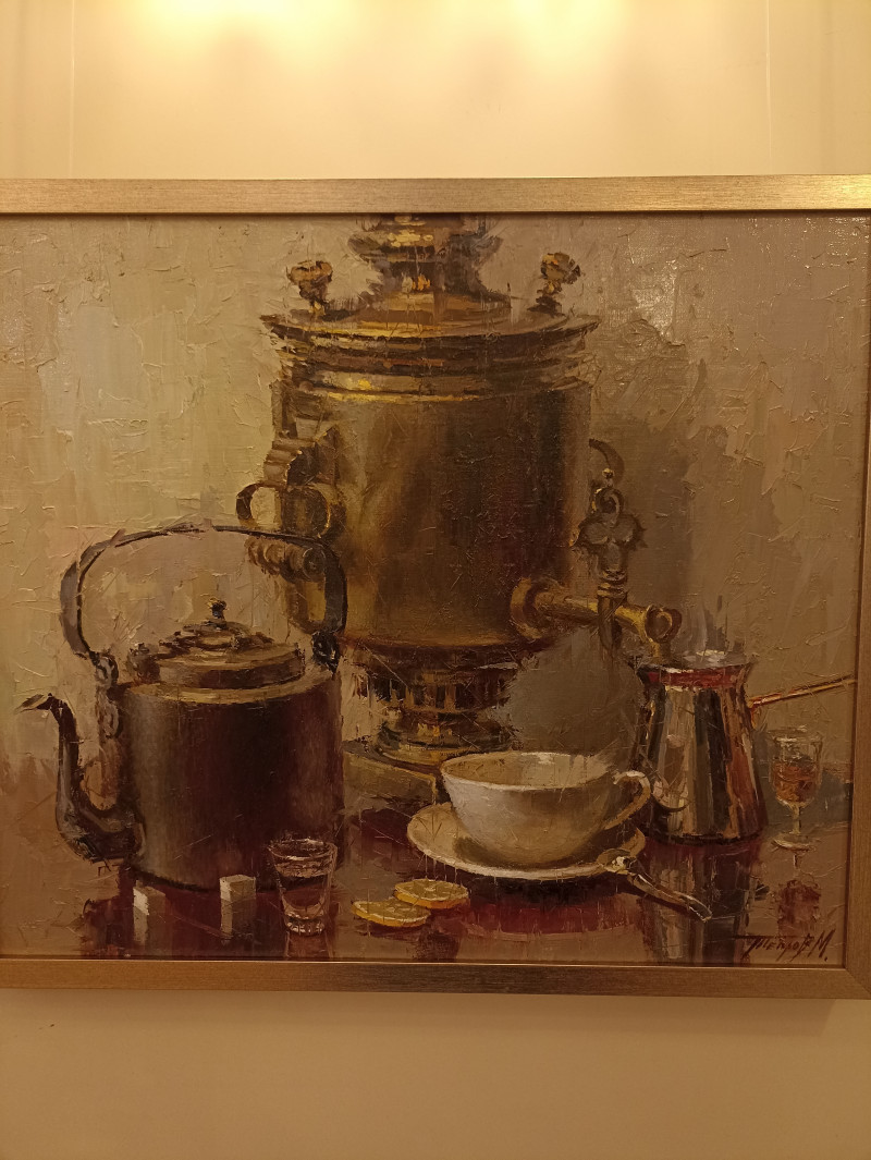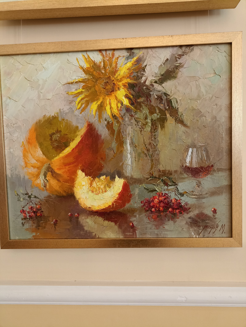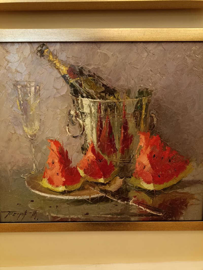 И вот сегодня я попадаю в театр драмы имени Волкова. А там добавочно была выставка художника Максима Теплова. Когда я увидела "Арбузный фреш", то вспомнила работу Галины.