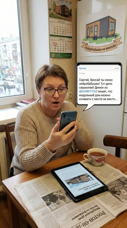 «Сергей, бросай ты своих нейробабушек! Тут дело серьезнее! Димон из @GORKY1152 пишет, что модульный дом можно кочевать с места на место, как цыганский табор, и налоги не платить! А если на фундамент поставить — сразу в ЕГРН и плати! Ты ж технический гений! Сделай мне модульный дом на колесах, но чтоб внутри все было по-людски: и банька, и свечной станок твой, и чтоб баба Нюра могла своих нейробабушек на семинары собирать! Будем передвижной клуб "Нейробабушка-на-колесах"! Нарубим дров в одном регионе — переехали в другой, пока налоговая ищет! Это ж необратимые последствия в хорошем смысле! 😉😂»