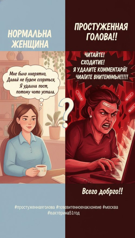 — Это не мой пост! Читайте внимательно!!! — Комментарий был неэтичный! — Я удалила всё! Я терпеть не могу срача! — Всего доброго!!