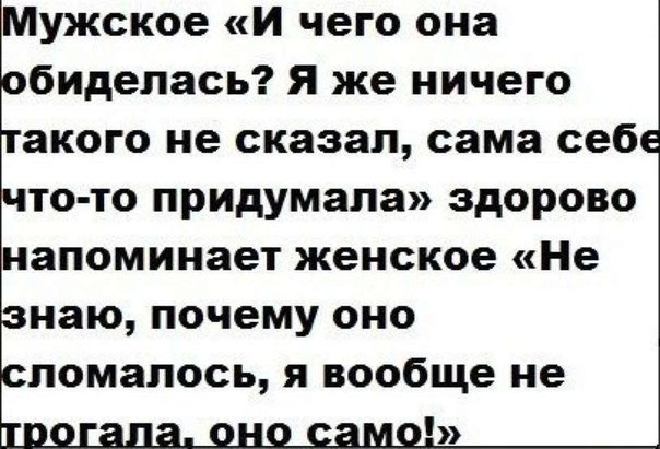 # Обычно сарказм использую с утра в отношении только мужчин,обменявшись оскорблениями можно спокойно доживать день. Все оппоненты понимающие и принимающие такую форму разрядки и снятия напряжения,стресса. Думаю отсюда растут ноги, в том что женщины не понимают юмор-мужчины в этом плане более лояльны. Даже к черному юмору.