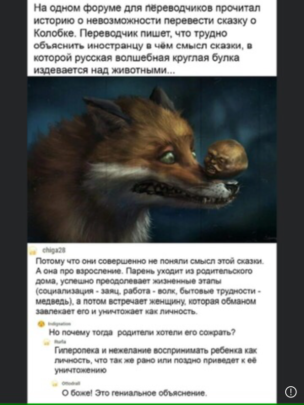 Получается, все те, кто говорили ему правду, оставались ни с чем, а кто грамотно сближался, насытился до следующего Колобка. Ведь по сути, удел Колобока быть съеденым, а не найти свою Колобчиху... ))