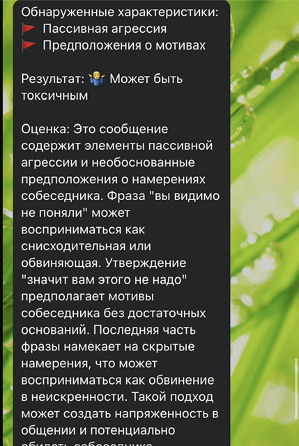 Единственное, прицельно искала, какое сообщение ИИ не забракует как токсичное хоть в какой-то мере, и нашла )