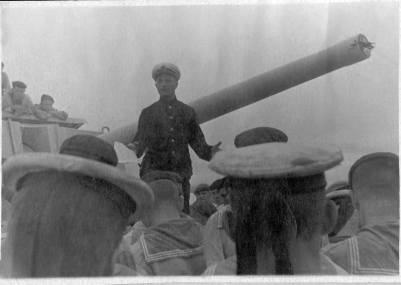 Дедушка (он был парторгом) выступает перед матросами.