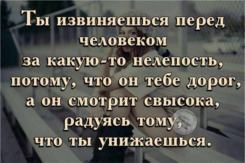 Никто не считает себя виноватым. Для нее это извинение виноватой стороны. Она не считает, что унижает. Радуется тому, что мужчина признал свою ошибку и надеется, что в будущем такая ситуация больше не повторится. А он, оказывается, только сделал вид
