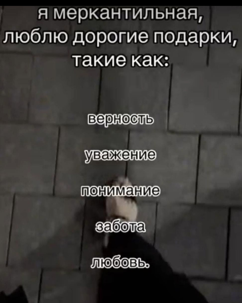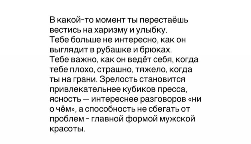С мужчиной должна ощущать себя ребёнком, желающим на ручки. С ним страсть и жажда переполняют тебя. Потому что твой мужчина, — это ТВОЙ персональный наркотик. Никаких отговорок, оправданий и отмазок, — он ломает все преграды, чтобы быть рядом. Потому что ты — ЕГО ДЕВОЧКА и этого достаточно, чтобы лететь, бежать, ползти в твою сторону. Ты для него — вечная борьба за главный приз всей жизни. Он для тебя — настоящий герой нынешнего поколения.