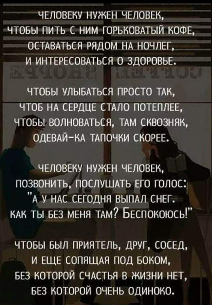 Человеку нужен человек не для того, чтобы заполнить пустоту, а для того, чтобы быть живым. Чтобы чувствовать тепло, которое не измеряется градусами, а выражается в заботе, внимании, искренности. Чтобы быть услышанным, увиденным, понятым.