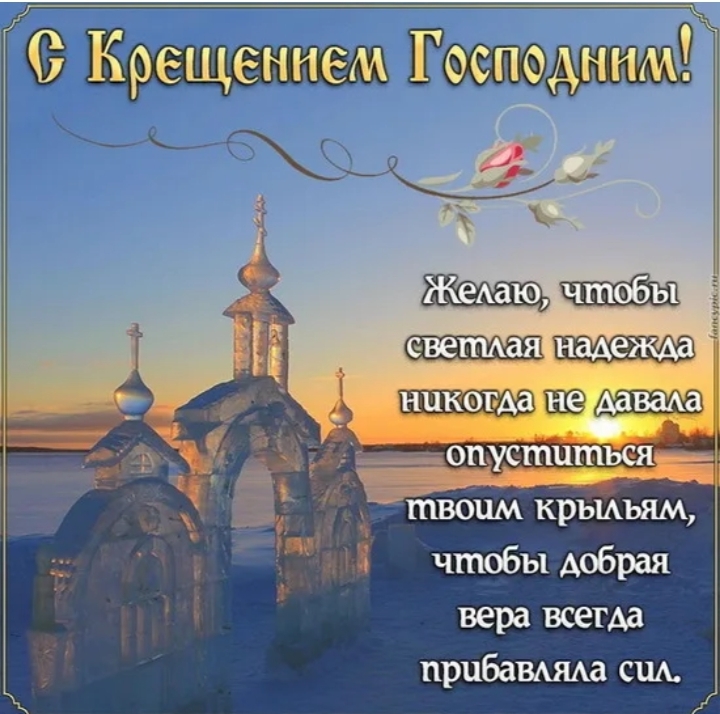 Танечка, добрый вечер! С Праздником Вас, с Крещением Господним! Желаю, чтобы рядом с Вами были Счастье, Любовь, Доброта, Удача. Это касается и людей, чтобы только Счастливые люди касались Вашего сердца и ума!