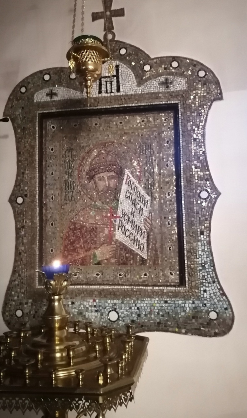 Что касается непосредственно мозаики, то, к сожалению, ничего в интернете не нашла, даже фоток. Могу только упомянуть надпись на иконе.