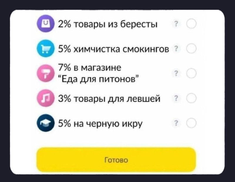 Типичные кэшбэки от моего банка. Если ваш питон левша и питается чёрной икрой, то вам повезло!