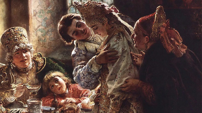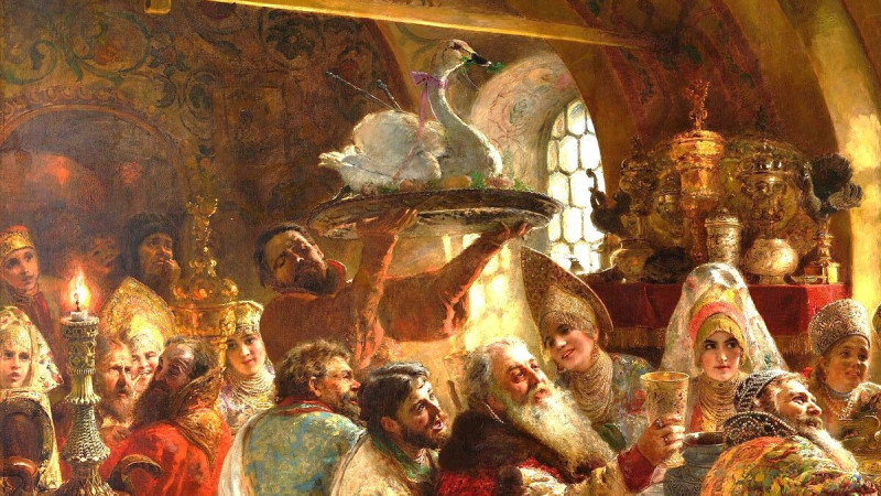 Сюжет: свадебный обряд в России XVII века. В роли невесты выступила жена художника Юлия, сам он показан в образе жениха. Возле него за столом сидит их сын Сережа. Богато убранные чертоги наполнены роскошными сундуками, драгоценными кубками, роскошной посудой.