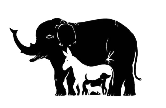Слон , носорог, крокодил, черепаха, осел, собака , кот, комар, мышка, акула