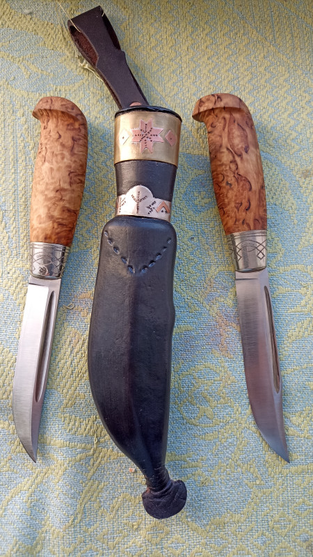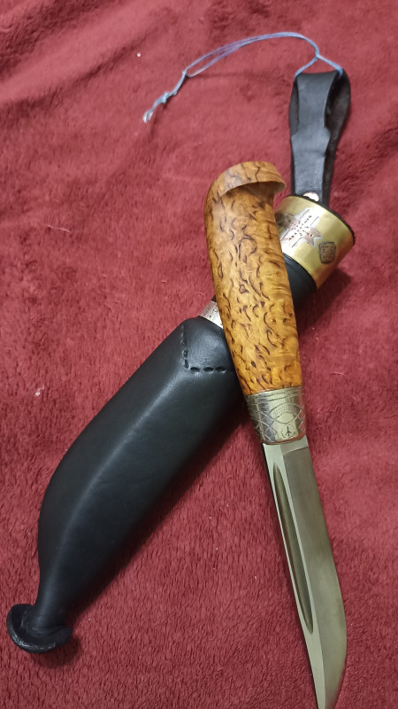 Карельская берёза — разновидность берёзы повислой, известная узорчатой свилеватой текстурой древесины. Характерные утолщения на стволе (кап) — одна из особенностей этого дерева. На фото ручки из каретки, рисунок не обычный, По средине кап берёзовый, А так нац нож карел и финнов это,