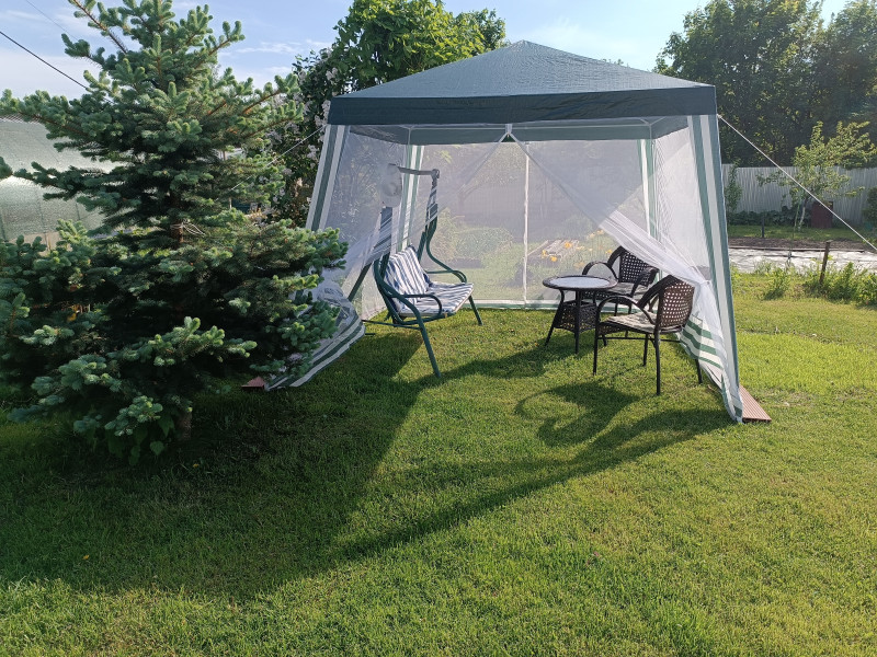 Сидеть бы вместе с собаками дома, под кондиционером, но wildberries привёз тент- беседку. Собирала с помощью изоленты и какой-то матери. Всё легко впихуемое и также легко выпихуемое. Думаю, до первой грозы хватит.