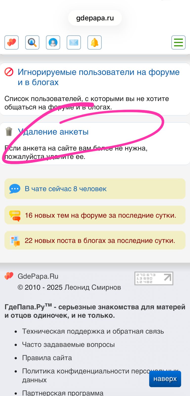 # Я уже не первый раз сталкиваюсь с восклицанием о том, что не могут удалить анкету. И не только здесь. Я сейчас не о качестве сайта, как такового. Это дело вкуса. Я вот по поводу простого технического действия - удаления анкеты. Это такая беспросветная компьютерная безграмотность или безмерное лукавство? На любом ресурсе никто не скрывает, как это сделать. В крайнем случае, есть техподдержка. Они обязательно подскажут. Если этого действительно хочется. А так, похоже, что такая неуклюжая форма привлечь к себе внимание. Уж извините за жесткость моего высказывания.