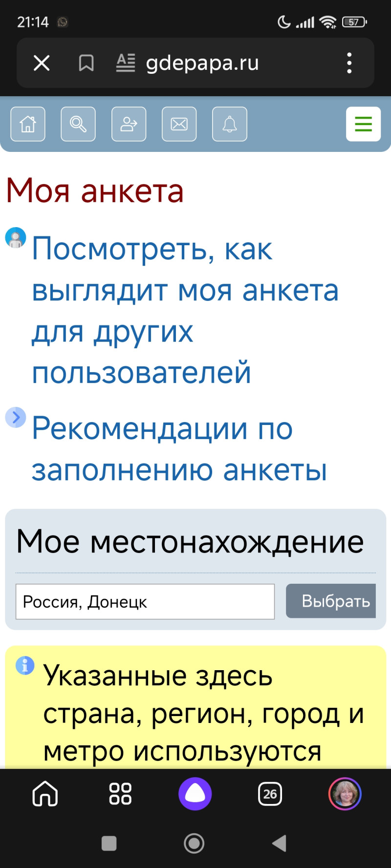 Есть значок ( или просто нажмите на свое фото) - посмотреть, как анкета выглядит для других - поможет увидеть косяки