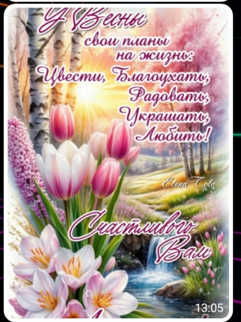 Девочки мальчики с днём весны вас всех кто зашёл ко мне в гости в мой блог желаю всем здоровья благополучия а самое главное - это мирного неба над головой люблю всех душой/