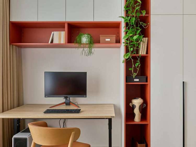Простая, но стильная обстановка и гармоничная палитра способствуют психологическому комфорту, а горизонтальные и вертикальные цветовые блоки визуально изменяют пространство.