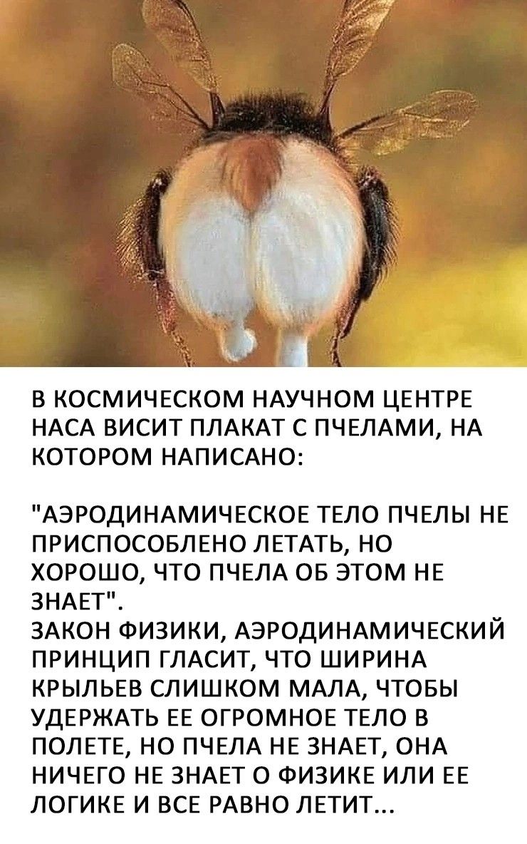 В космическом научном центре NASA висит плакат с изображением пчел и надписью: "Аэродинамическое строение тела пчелы не рассчитано на полет, но хорошо, что пчела об этом не знает". Согласно законам физики и аэродинамики, крылья слишком маленькие, чтобы удержать её массивное тело в воздухе, однако пчела этого не осознает и всё равно летает. Это пример того, что мы все можем делать — летать и побеждать в любой момент, несмотря на любые трудности и обстоятельства. Будьте как пчёлы, не обращая внимания на размер крыльев, летайте и наслаждайтесь жизнью.