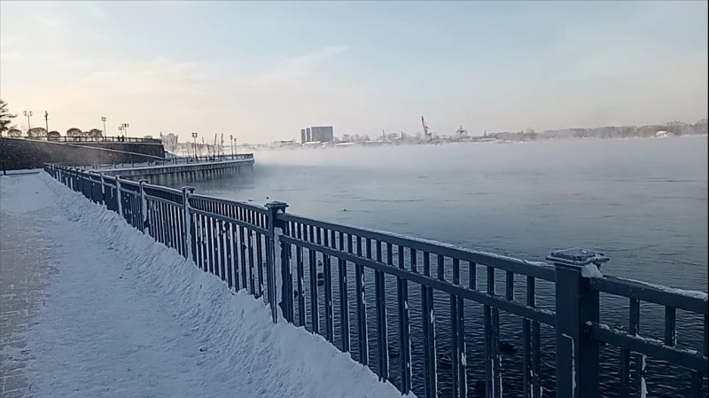 Набережная Ангары. Мороз минус 30. Здесь только я и одинокий рыбак вдалеке. Вдруг по лестнице сбегает мальчик лет пяти и кричит папе, только начавшему спуск: