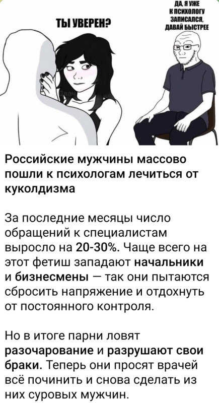 Неужели Вы доверяете этой информации? Откуда она?.. Что значит « массово»? Откуда статистика про 20-30%? Может, в прошлом году было 10 человек на всю страну, а в этом- 12.. Это- массово? Откуда статистика про социальный уровень фетишистов, про то, что они в итоге разрушают браки?.. Я к тому, что очень наивно доверять всему, что попалось на глаза.