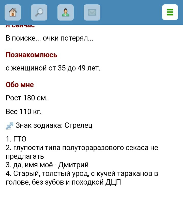 Сами посудите, если дама ищет мужчину всерьез, ей одного описания внешности-возраста и количества тараканов мало будет))