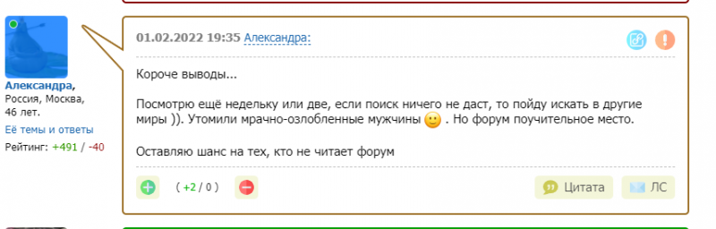 https://gdepapa.ru/forum/dating/radost/topic36725/?page=24#msg3778443 Посмотрю ещё недельку или две, если поиск ничего не даст, то пойду искать в другие миры )). Утомили мрачно-озлобленные мужчины