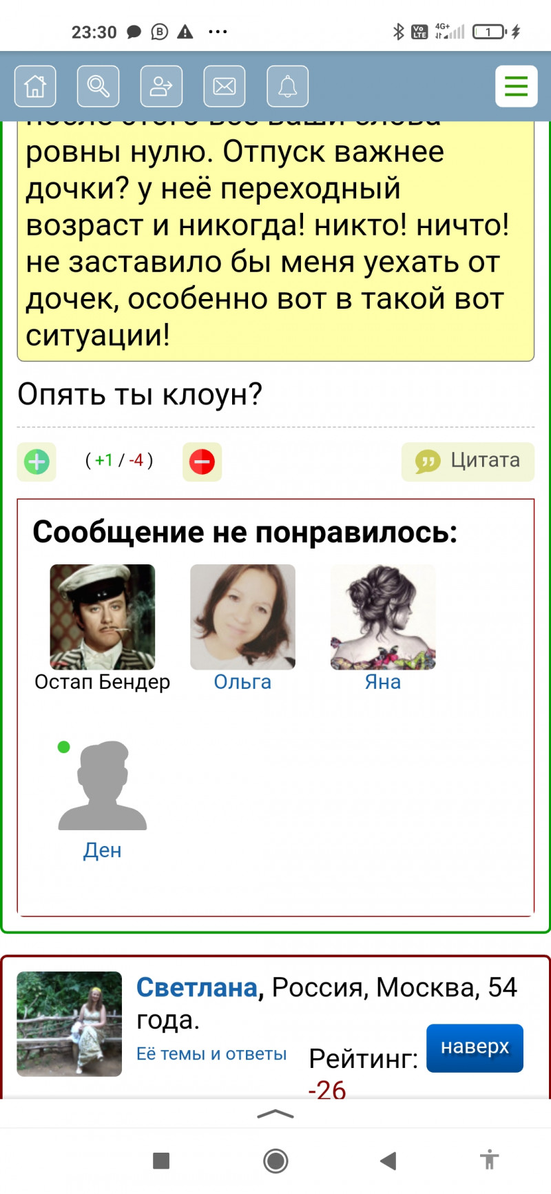 Люди ,вы за что мне минусов понаставили?? )) Я аватарку увидела , на ней клоун как раньше когда то у него был -грустный клоун , он то ставил его , одно время ,потом убирал слава Богу , я, увидев снова клоуна , удивилась , спросила - опять ты клоун? Мде, тяжёлый случай)
