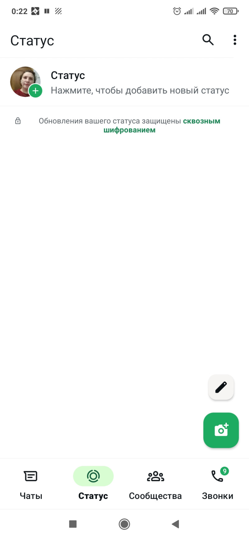 Не, я вчера попробовала. Твм на странице, где список чатов значок фотика вверху. Его нажимаешь, снимаешь. А потом вотсап предлагает отправить снятое в чат или в статус. Статус, получается, это как сторис в инсте или вк