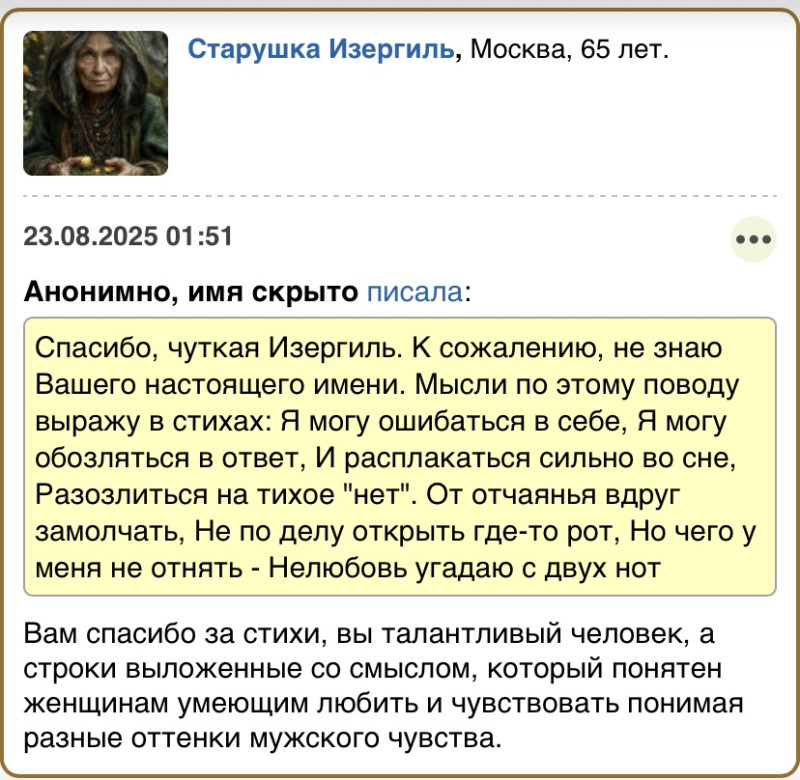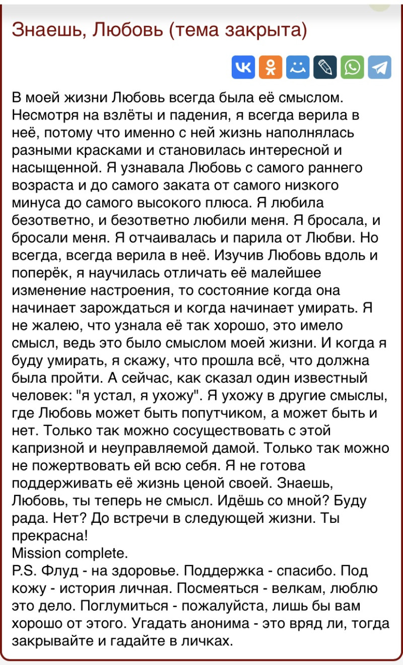 Разрешите ТС использовать тему о любви для постороннего комента. Возник повод обратиться к анонимке которая создала тему в ночь пятницы и она быстро закрылась. Настолько удивила манера изложения своих чувств и тронула сердце. Испытываю уважение к тем кто талантливо может излагать ощущения и чувствовать изысканно. Вдруг читаете тему и захотите ответить в ЛС. Захотелось пообщаться с такой удивительной женщиной в реале. И если живёте далеко, когда захочется и получится приехать в Москву, заранее гостеприимство предлагаю и дружбу.