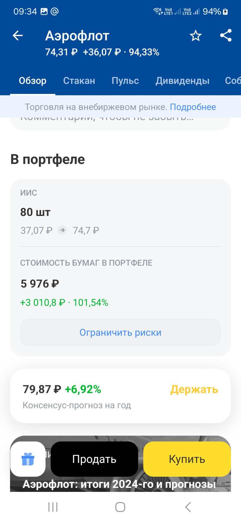 Аэрофлот Есть желание продать пакет Причины: Прогноз на околонулевой рост по итогам года Консенсус-прогноз - держать (читай продать) Бумаги куплены на минимуме цены и неплохо выросли Что думаете?