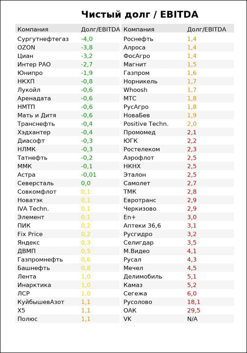 На таблице выше я выписал долговые нагрузки по 68-и крупнейшим компаниям на РФ рынке. Если показатель отрицательный, то это означает отсутствие чистого долга и крепкое положение в компании (см. на фото зеленым). Норма чистого долга/EBITDA сейчас до 1,5x, чтобы комфортно платить дивиденды и развиваться.