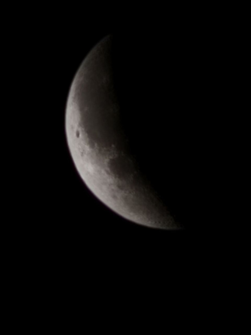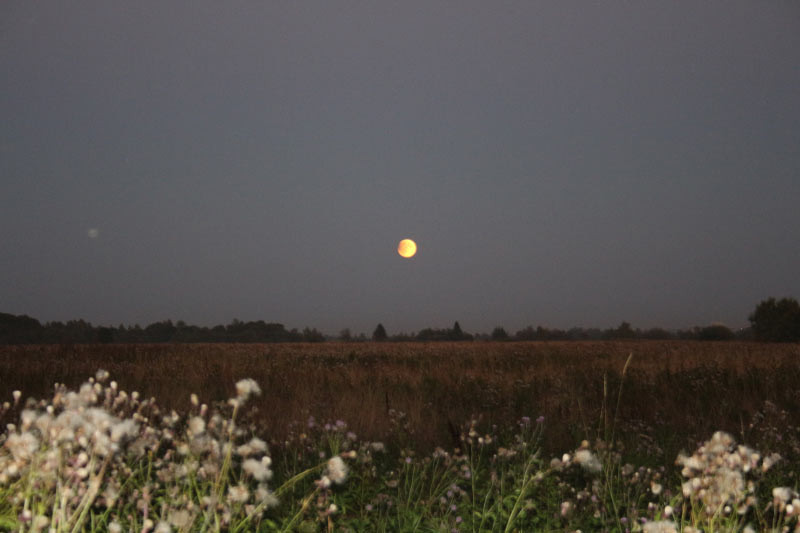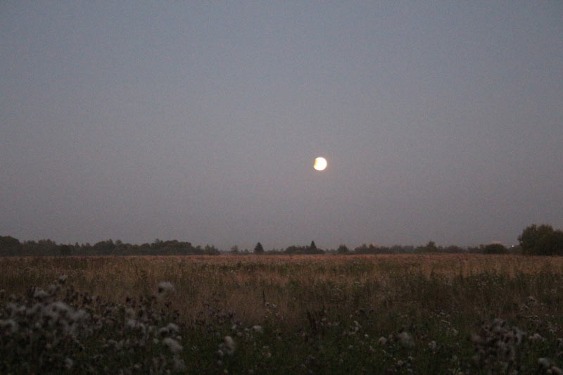 Самое начало. Луна низко, пришлось выйти в поле, с дачи в телескоп ее не видно, мешают дома и деревья.