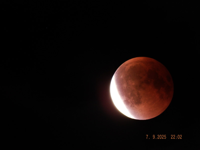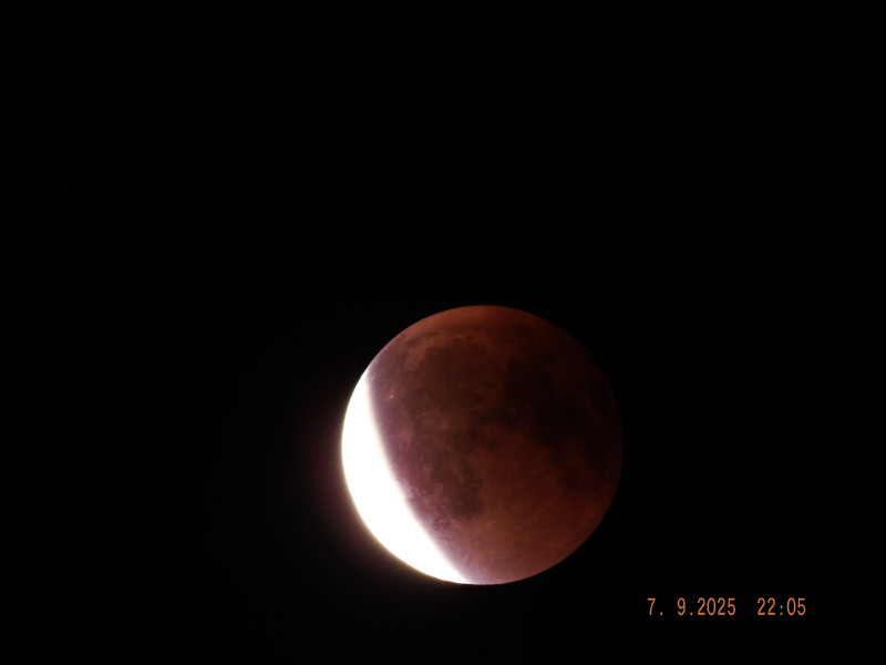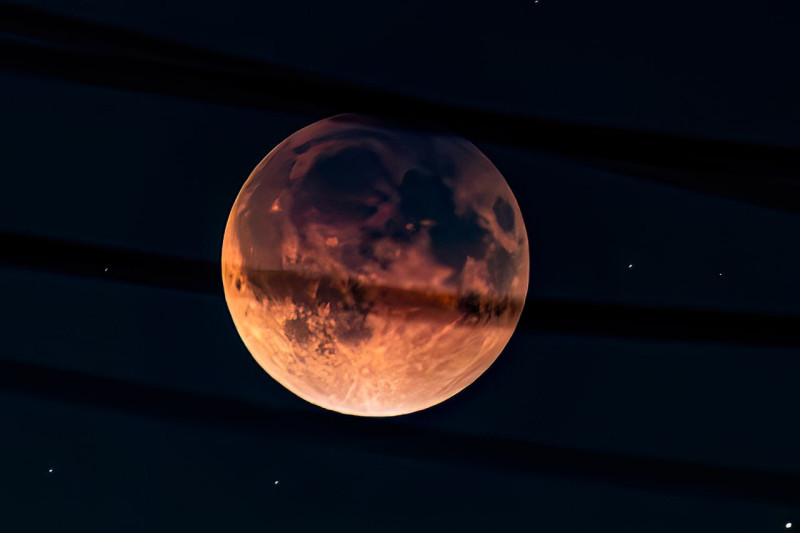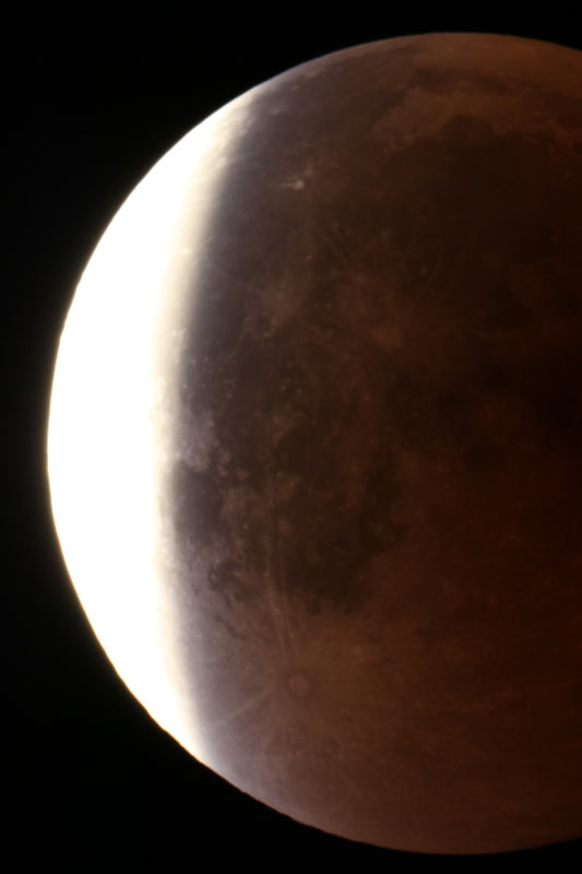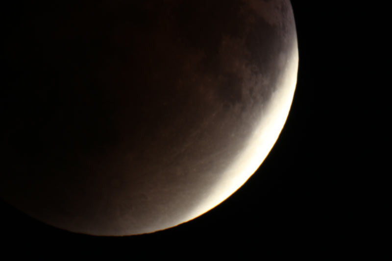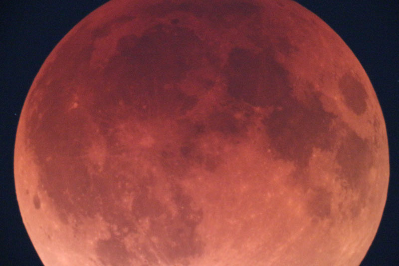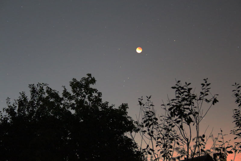Затмившаяся, красная Луна. Красный цвет виден только на фото, при большой выдержке, если смотреть просто в телескоп, то Луна просто очень темная.