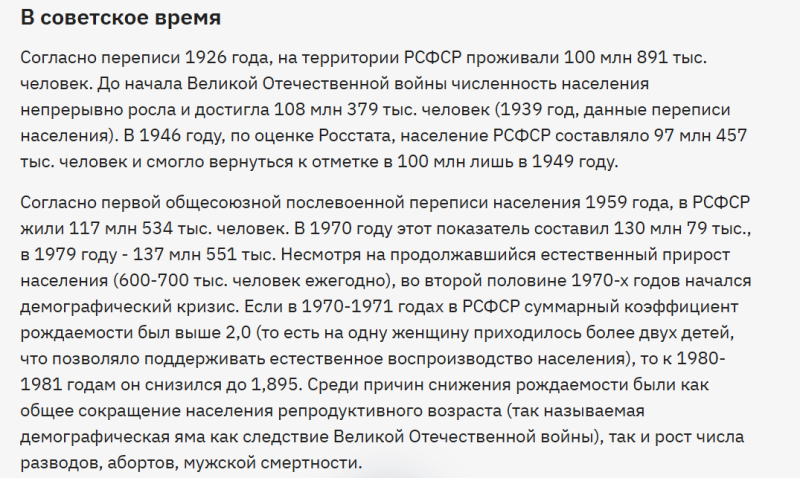 Население росло даже с учетом потерь в ВОВ. Не надо сказки рассказыаать. Достаточно посмотреть на количество населения. 159,2 млн человек — на конец 1913 года; 147 млн человек — на 17 декабря 1926 года; 194,1 млн человек — на 1 января 1940 года; 178,5 млн человек — на 1 января 1950 года; 208,8 млн человек — на 15 января 1959 года; 241,7 млн человек — на 15 января 1970 года; 262,4 млн человек — на 17 января 1979 года; 266,6 млн человек — на 1 января 1981 года. Первая цифра это РИ с учет
