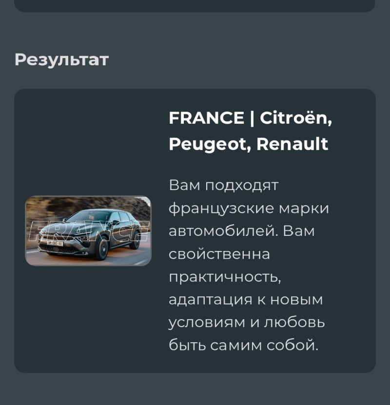Задумалась... Пошла, нашла тест. Прошла. Результат Кому вдруг тоже интересно, вот ссылка https://pikuco.ru/passes/57554621-1762100144/