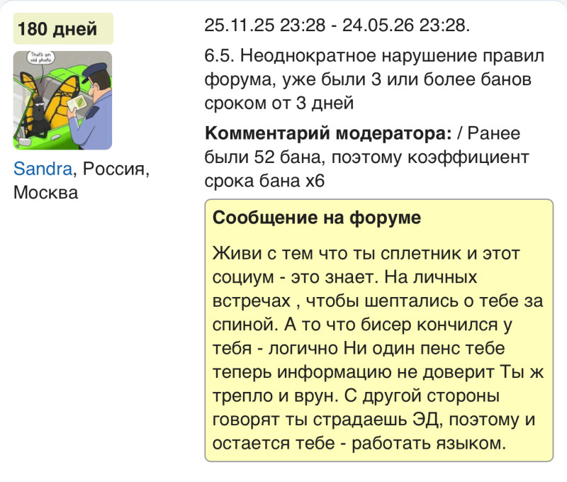 Всем привет. Увидела, что уже появился срок бана длиною в полгода. Ну... Конечно, вечно униженные и оскорбленные будут хлопать в ладоши. Но-таки, Леонид, адекватность же какая-то и соразмерность должна быть?
