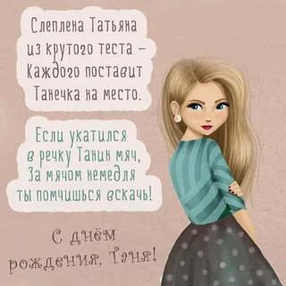 С днём рождения Татьяна. Удачи во всем , здоровья и счастья в личной жизни без головных болей ! 🎂🍾🥂🎊🎉🎈🎆🎇😜