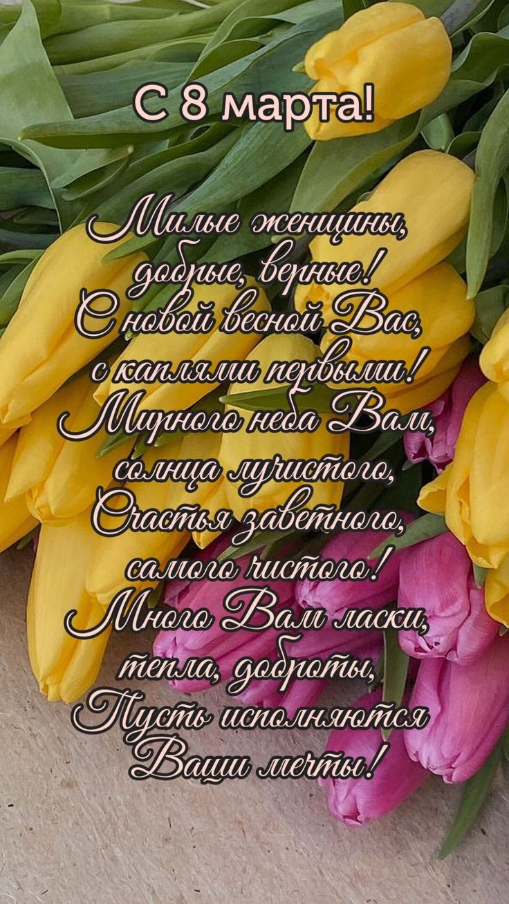 Дорогие женщины! В этот прекрасный день хочу поздравить вас с праздником 8 Марта! 🌷❤Вы — воплощение силы, мудрости и красоты. Пусть каждый новый день приносит радость, а в сердце живёт любовь. Будьте счастливы и любимы, ведь вы достойны самого лучшего.🥰🔥🥂