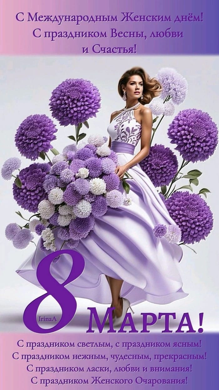 Милые, прекрасные форумчанки , поздравляю Вас С Международным Женским Днем! Желаю вам и вашим родным счастья,любви,прекрасного весеннего настроения! Пусть в этот день весна цветёт в душе, а в сердце живёт ожидание чудес и приятных сюрпризов, пусть все ваши мечты исполняться !