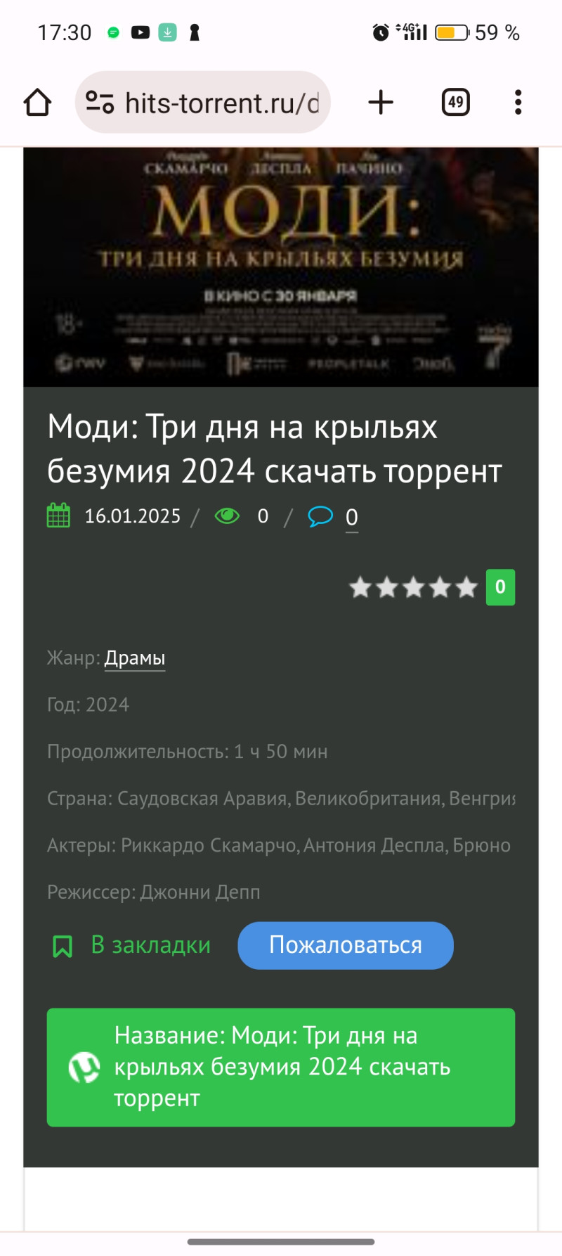 Дата: 31.01.2025 (пятница) Город: Москва, м. Арбатская Место проведения: Кинозал Дом журналиста, Никитский бульвар 8а Время начала: 19.00 Статус: назначена и состоится Всем привет. 31 января в пятницу после работы планирую сходить в кино на фильм "Моди. Три дня на крыльях безумия". Кинозал Дом Журналиста Сеанс 19.00 Продолжительность 110 минут Жанр: драма, комедия Фильм на языке оригинала с субтитрами Режиссёр Джонни Депп В ролях Риккардо Скамарчо, Антония Деспла , Б
