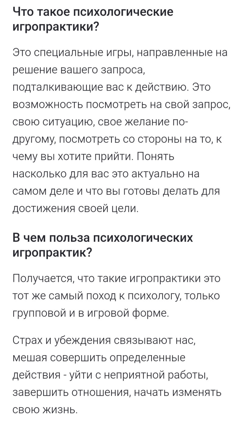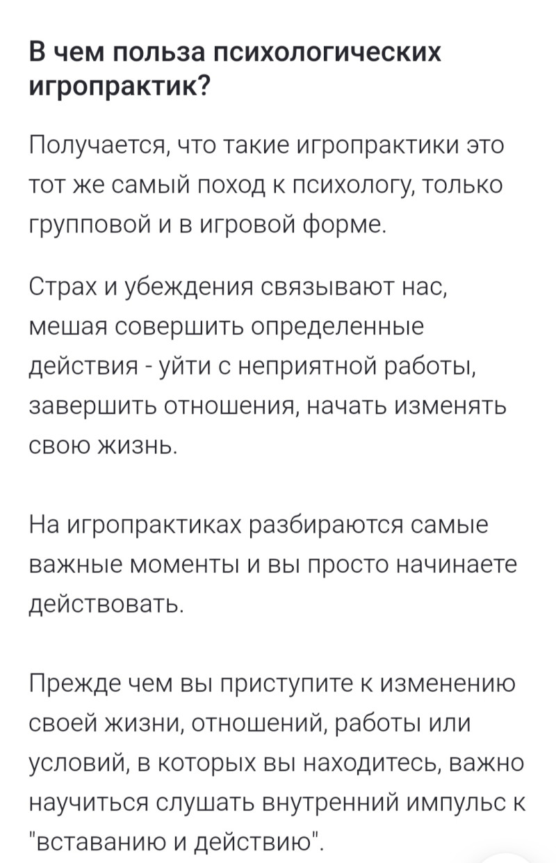 Не совсем так. Игр очень много, совершенно на разные темы. Есть универсальные, в которые можно зайти с любым запросом, есть тематические например, про внутренние страхи, игры-тренажеры на проявление себя, развитие своего бренда, родовые сценарии и много-много других. Я в прошлом году обучалась в этой школе, отличное обучение и качественные мероприятия они проводят.