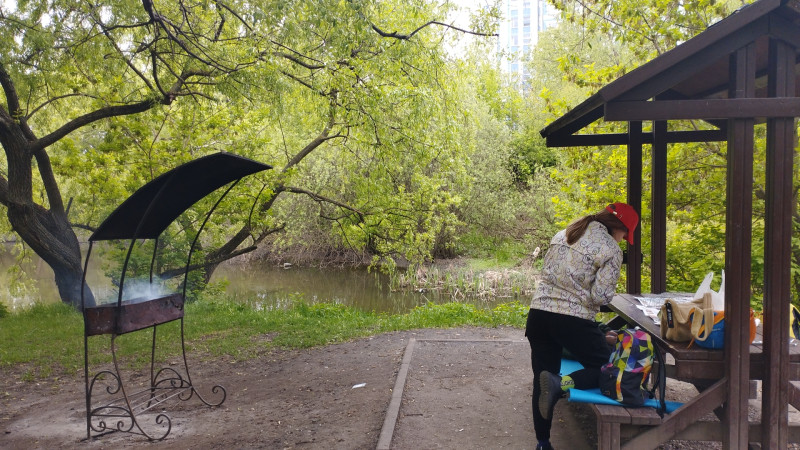 Да, перебазировались левее, в беседку с крышей, также у речки.